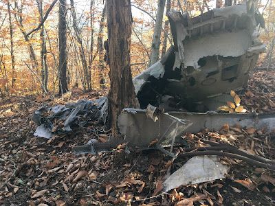 On the way back down, I took an off-trail detour to another geocache. Descending the ledges, stepping between boulders strewn with newly fallen leaves, was a little worrying, but I made it safely down and quickly found the cache and the plane crash it memorializes.